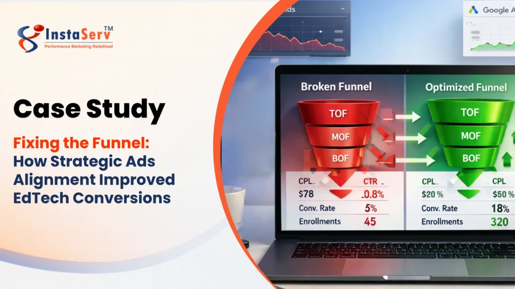 This case study explores how InstaServ conducted a strategic evaluation of a growing EdTech brand in Australia that was generating leads through Google and Meta Ads but struggling with low qualification rates, generic creative messaging, and fragmented data systems.